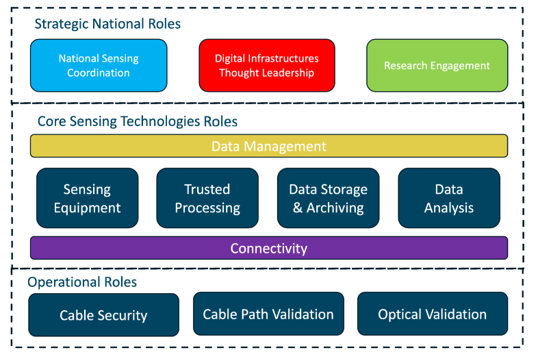 NRENs have a variety of different stakeholders and national contexts which need to be appreciated when suggesting possible roles to be fulfilled. As such the diagram below identifies different roles to which an NREN could potentially contribute, should they wish. However, it should be understood that all of the aspects would need to be fulfilled at a national level in order for fibre sensing to be possible. An NREN can play a crucial role in supporting the development of this type of infrastructure and is uniquely positioned to enable such an instrument to be created in their country.
