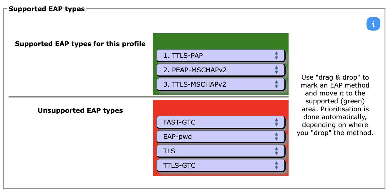 The third part of profile generation is about the EAP types which you've configured in your RADIUS server for this user group. By simple drag&drop, please drag all the EAP types you support into the upper green area. The list is ordered by preference, so drag the EAP types into your preferred order. The CAT will always compare the EAP types you've configured here with the capabilities of the various devices which are to be configured. If the device supports your most preferred EAP type, installers will always be generated for that EAP type. If your preferred EAP type does not work on a given device, the preference list is worked through until a match occurs, and then installers for that device will use that not-so-preferred EAP type (which is better than not supporting eduroam configuration at all). Finally, if there is a complete mismatch between the EAP types you support and the EAP types on a device, then we can't generate installers for that device. You might be luckier if you can change your RADIUS setup to support more EAP types then.