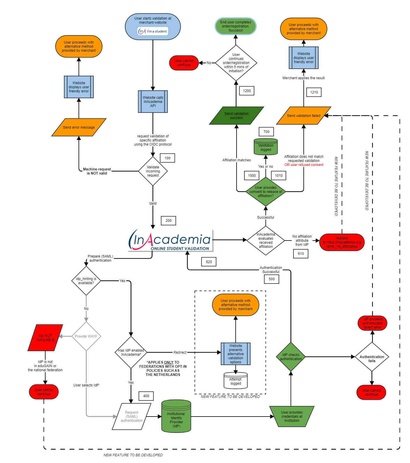 The figure presents the 'happy' flow, ending in a successful validation, as displayed in green, as well the possible error scenarios represented in red or orange. The error situation where a institutional IdP, or teh merchant redirect URL component cannot be reached because of network issues or similar is not take into account as that is out of scope and control for InAcademia and will always yield an some error in the users browser.