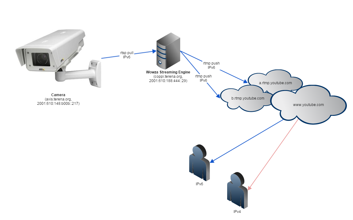 - Production side is IPv6-only. Both the camera and the relaying system do not need to be publicly available. The camera just needs to communicate with the relaying system, which in turn needs to talk to YouTube. Since YouTube is dual stack, this means that both the camera and the relaying system can be purely IPv6: