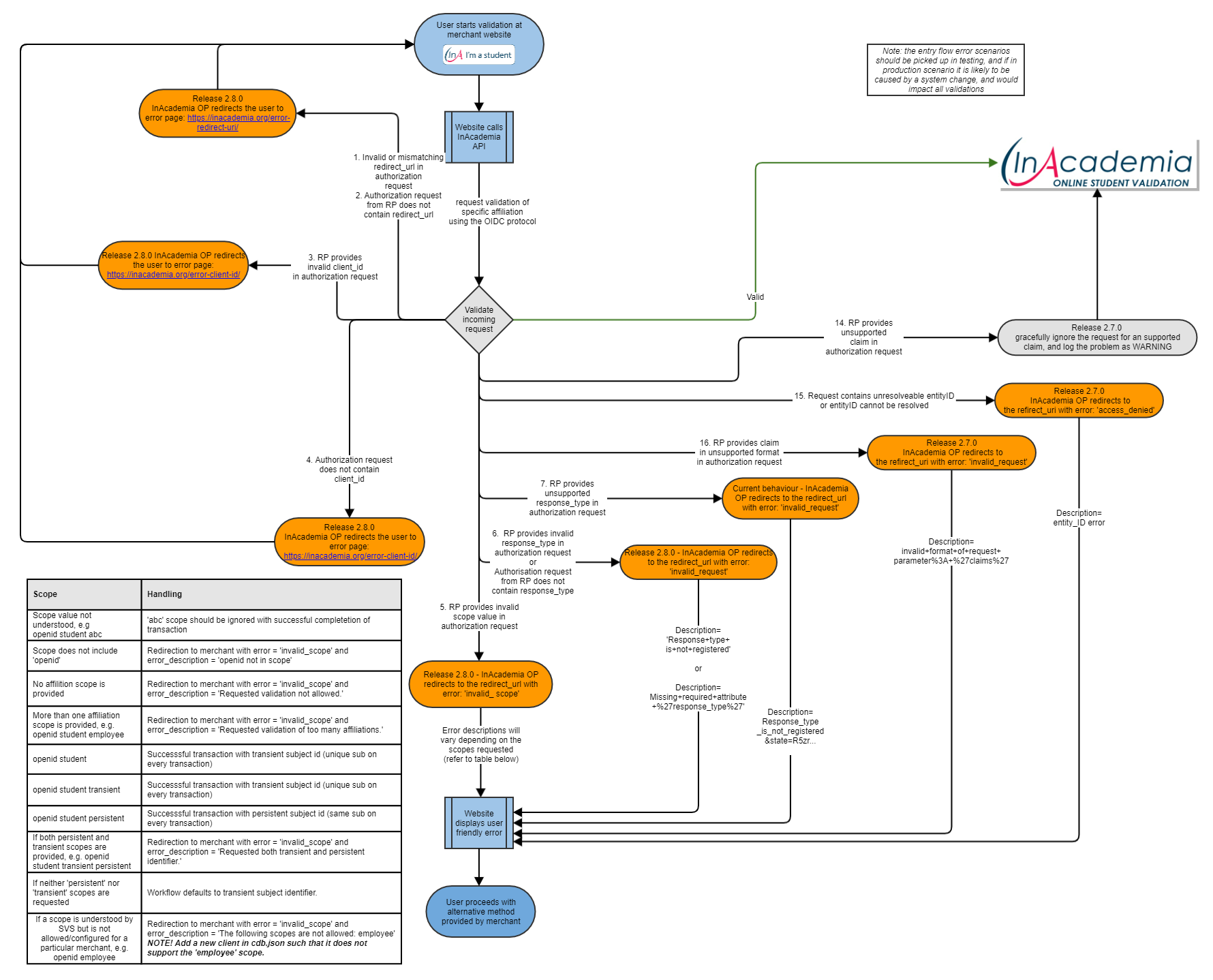 The figure presents the 'happy' flow, ending in a successful validation, as displayed in green, as well the possible error scenarios represented in red or orange. The error situation where a institutional IdP, or the merchant redirect URL component cannot be reached because of network issues or similar are out of scope and control for InAcademia and will always yield an error in the users browser. The InAcademia service is part of a continuing development programme and additional features planned for the future are also captured below.